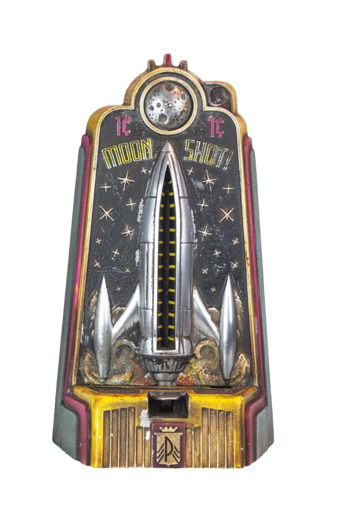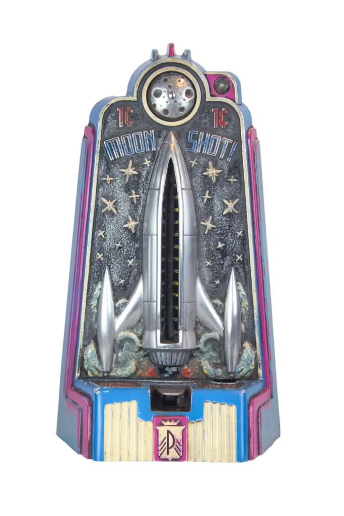 To engage with the piece, a single US penny is inserted into the coin slot at upper right. The penny descends into a launch chamber, primed for release. With one decisive strike to the launch plate, using only a single finger, the coin is catapulted upward through a rocket-shaped channel toward a mounted moon bell. A successful strike rings the bell and returns the penny to the player. Failure means the coin is lost to the machine.